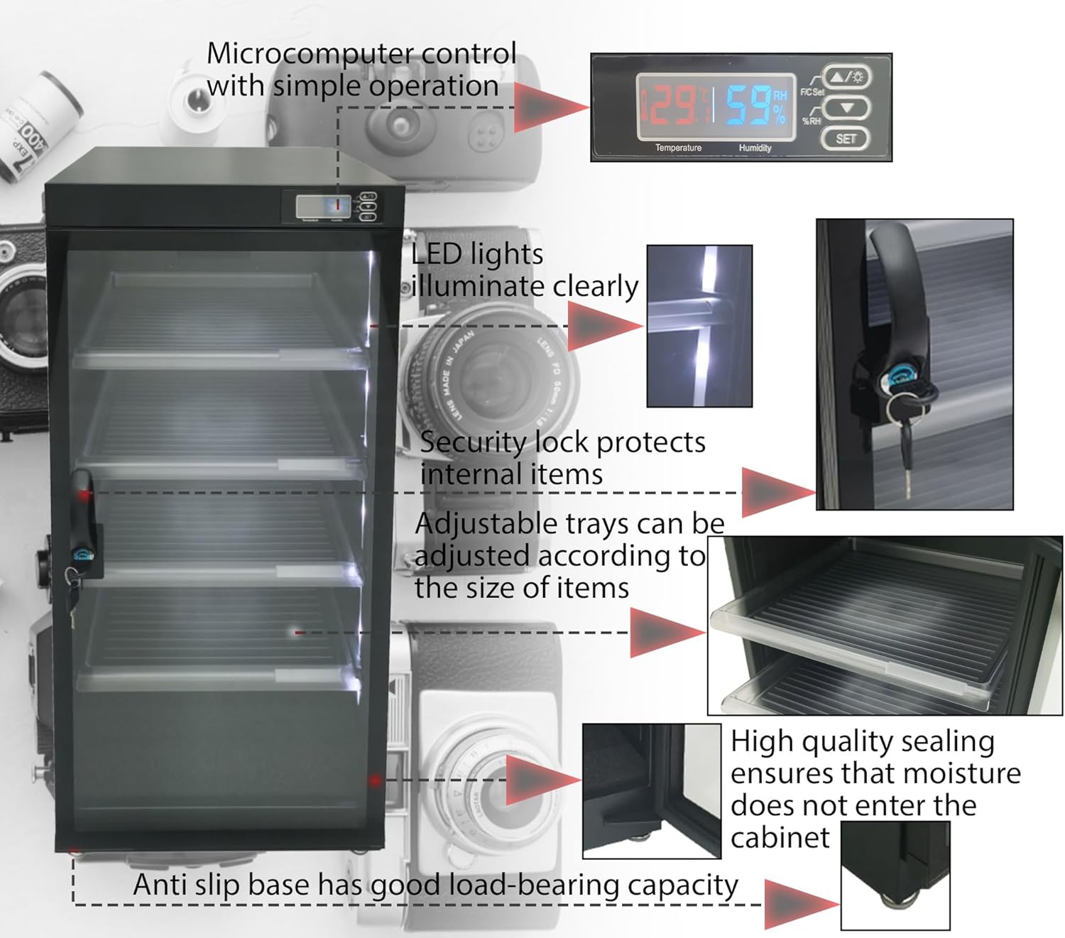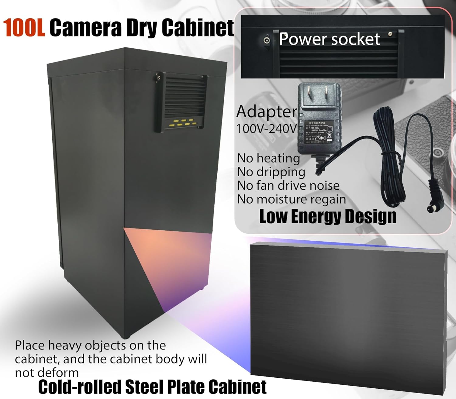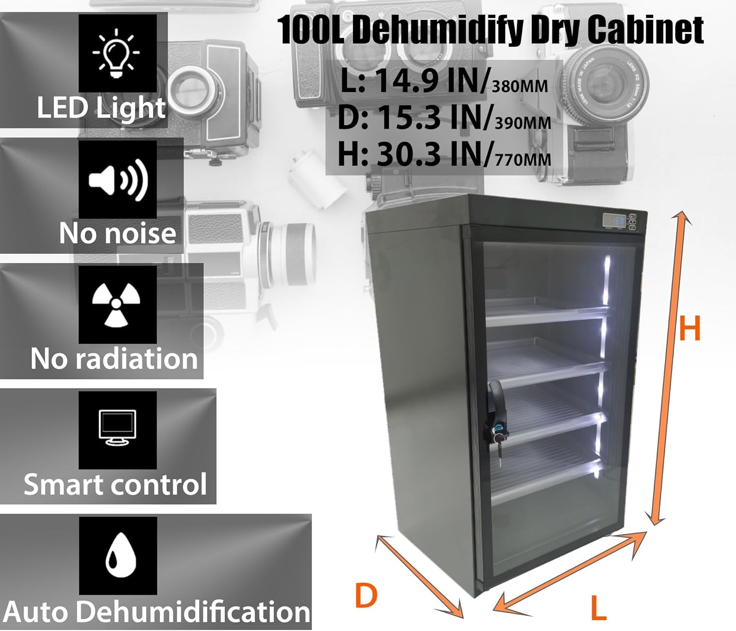 Features๐Camera lens dry cabinet 100l -Adopting the latest TE cooling chip design, it can quickly drive moisture and take effect within 1-3 hours -The humidity range is RH 25% -60% -No compression engine, no fan, no noise, no thermal effect. This cord adopts DC input, with low power consumption, energy saving, and no leakage risk -Prevent potential risks of high-pressure leakage or fire in stored items -Moisture-proof, rust-proof, deterioration-proof, dustproof, a lower cost storage method Be Careful -Do not place any corrosive, hazardous, volatile, or flammable materials inside; When storing food, drugs, or chemicals, please seal and store them separately to avoid leakage -Any odor and chemical vapor can contaminate other stored items and damage the drying machine -Do not disassemble the controller by yourself to avoid damage or danger -Please regularly check if the displayed humidity value (about 10 days) is within the ideal range. If not, please check the set value.๐บ๐ท๐ฌ๐ช๐ฐ๐ญ๐ฐ๐ช๐จ๐ป๐ฐ๐ถ๐ต๐บ: Volume: 100L Machine Material: cold-roll steel sheets/tempered glass door Size: 14.9 x 15.3 x 30.3in Control range of wet: 30%-60%RH Power: <8W Weight: 19.7kg/43.4lbs๐ท๐๐๐๐๐๐ ๐ช๐๐๐๐๐๐: 1 x Autotmatic Dehumidifying Camera Dry Cabinet 100L