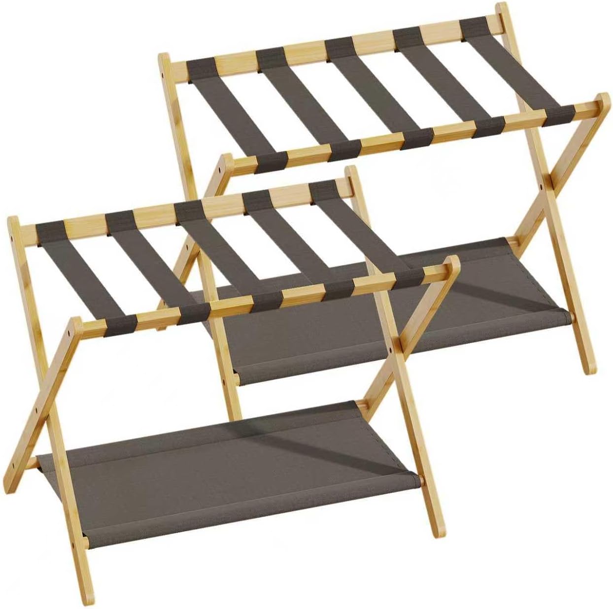Features of this bamboo luggage rack: -Made of natural bamboo, the bamboo luggage rack features an upgraded and thickened frame, making it stronger and more load-bearing. -With Upgraded 5 heavy-duty sturdy nylon straps offers matchless durability that can withstand up to 170 LBS heavy luggage without waggling. -The guestroom luggage stand is wide enough to hold any size luggage and bags, Expand size is 26.77"W x 16.73"D x 20.87"H. -Folding design is easy to move and store. when not in use, you can fold the luggage rack flat to store under the bed, in the closet, behind the door or just in the narrow corner. 26.77” x 25.98” in folding status, -The bamboo suitcase holder has a 2-tier design. The upper shelf can withstand 150 pounds and the lower shelf can withstand 20 pounds, Perfect for shoes, slippers, hand luggage, bags or other items. -Perfect for guestrooms, bedrooms, living rooms, hotel rooms, vacation trips or short term rentals, etc Installation: The bamboo luggage rack for guest room comes with all the required accessories and easy-to-follow installation instructions, just follow the instructions and it will be done in 5 -10 minutes. Specifications: ●Material: natural bamboo, nylon straps, fabric storage shelf ●Size of suitcase stand: 26.77"W x 16.73"D x 20.87"H inches. ●Folded size: 26.77” x 25.98” inches.