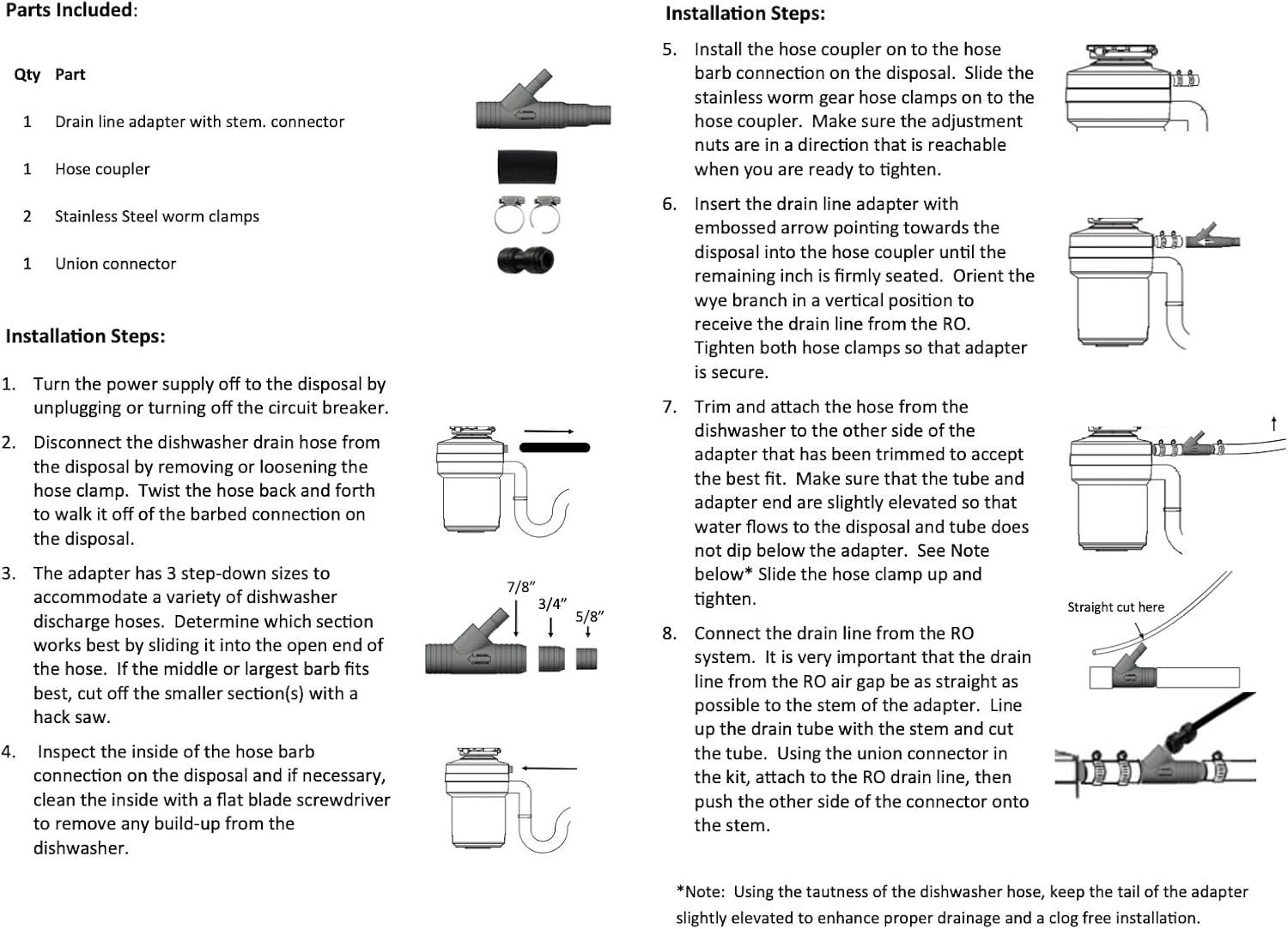 Neo-Pure RO drain adapters are designed for specific reverse osmosis system configurations. Confirm tubing dimensions and drain compatibility prior to ordering to ensure proper installation.